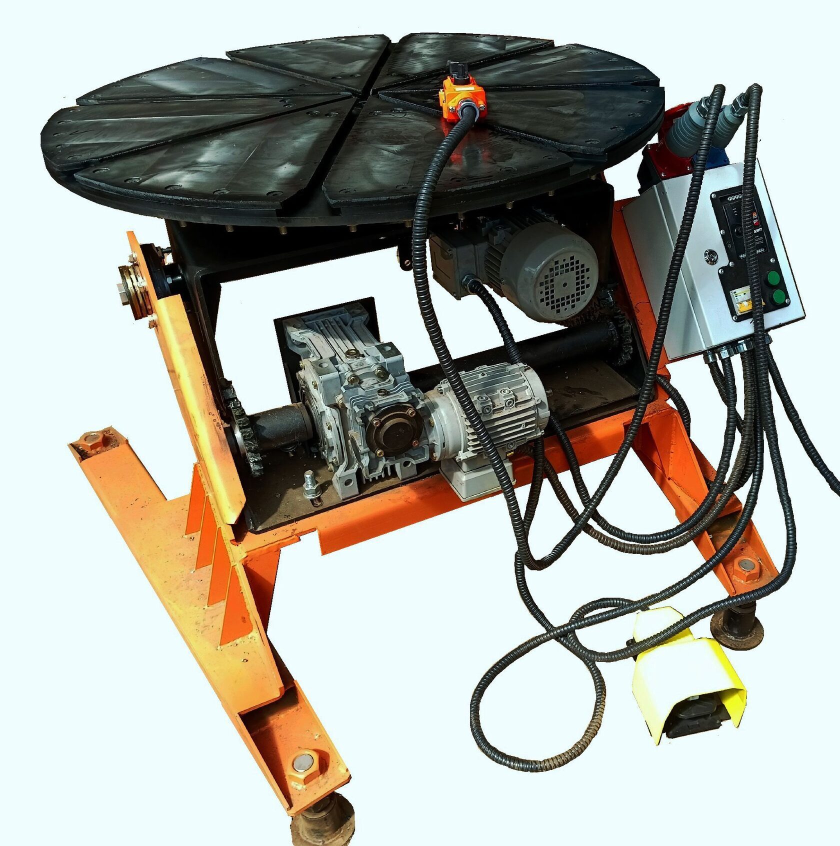 К категории наиболее универсальных принадлежат двухосевые сварочные вращатели. Они укомплектованы массивным круглым столом, называемым планшайбой, поворотным механизмом, обеспечивающим наклон от 0 до 90 градусов. Планшайба вращается вокруг оси, что позволяет развернуть изделие нужным образом, добраться до области формирования шва.